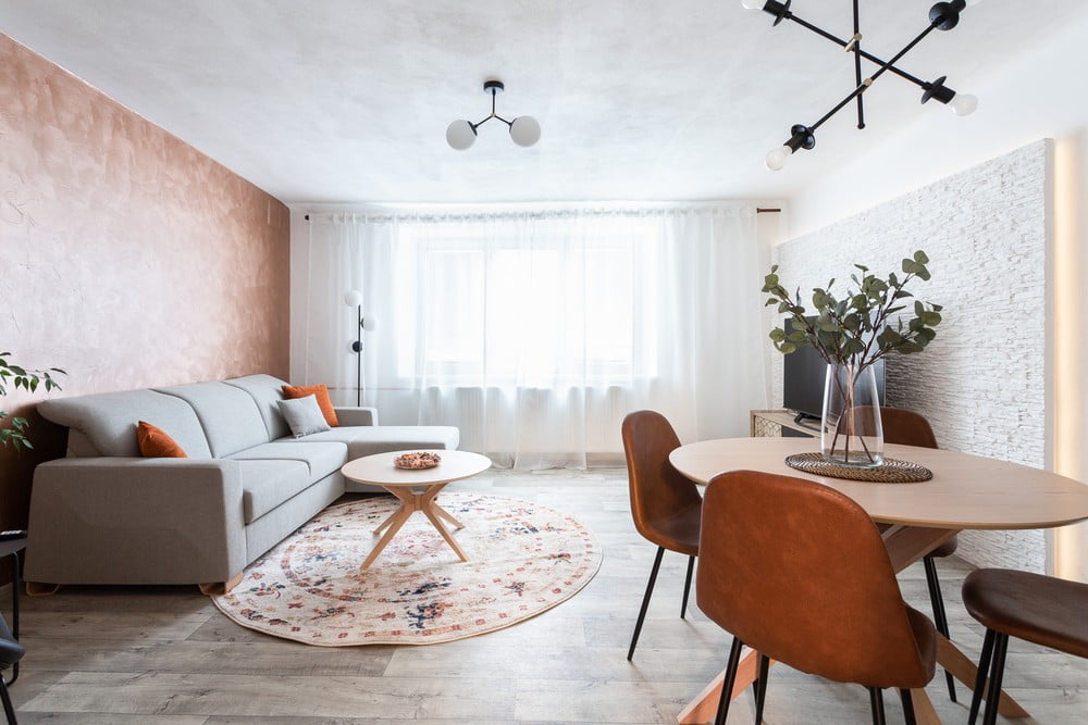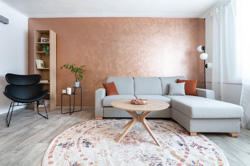 Medena barva je postala povezovalni element celotne notranjosti. Največja in najbolj prevladujoča je barva stene v dnevni sobi. Oblikovalci so z njo postavili temelj barvne palete, ki so jo dopolnili z nevtralnimi in umirjenimi barvami.