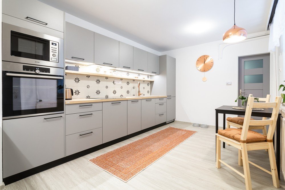 K enotnemu videzu je prispevala tudi nova vinilna talna obloga v barvi sivega hrasta, ki se ujema z lesenim delovnim pultom in policami ob kuhinjskih enotah.