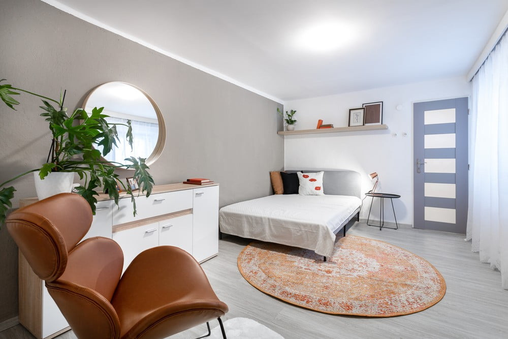 Oblaikovalci so spalnico v glavnem uglasili v sivo barvo, vendar tudi tu niso spregledali bakrenih detajlov v obliki svetilke in dveh abstraktnih slik, ki sta nastali po barvanju dnevne sobe.