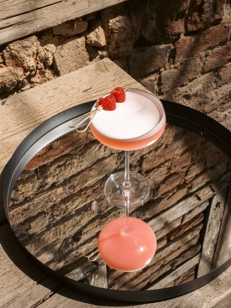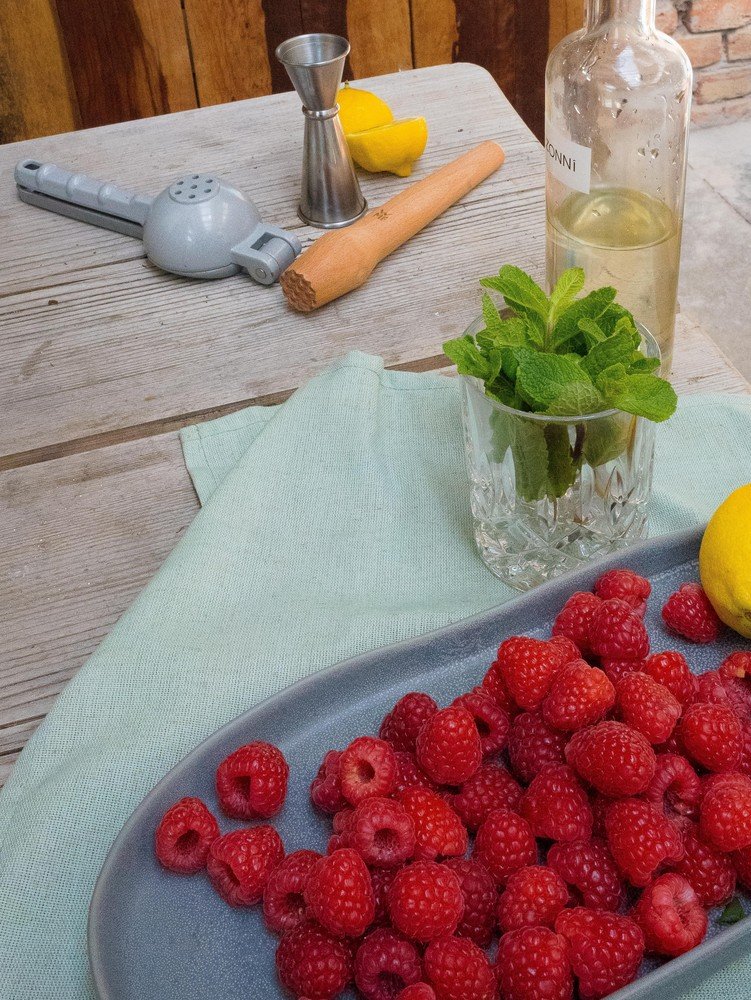 Nazadnje dve do tri sveže maline nabodite na koktajlno nabodalo in ga postavite nad kozarec.