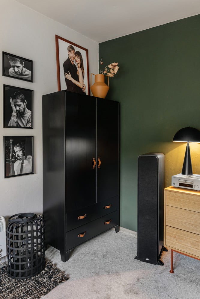 Največ pozornosti sem namenila prostoru za gramofon. Ta celotna stena naj bi služila zvoku in hkrati hranila veliko število plošč. Poleg tega je izbrana komoda precej velik in izrazit kos pohištva v majhnem prostoru.