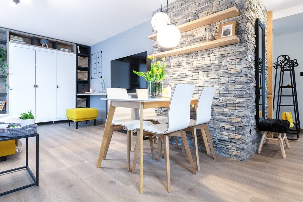 S postavitvijo sedežne garniture ob kamnito steno so ponovno subtilno ločili kuhinjo od dnevne sobe in se tudi tukaj odločili za preprostost. Pri stolu in mizi so izbrali elegantno obliko, klasičen skandinavski dizajn ter kombinacijo bele barve in svetlega lesa.