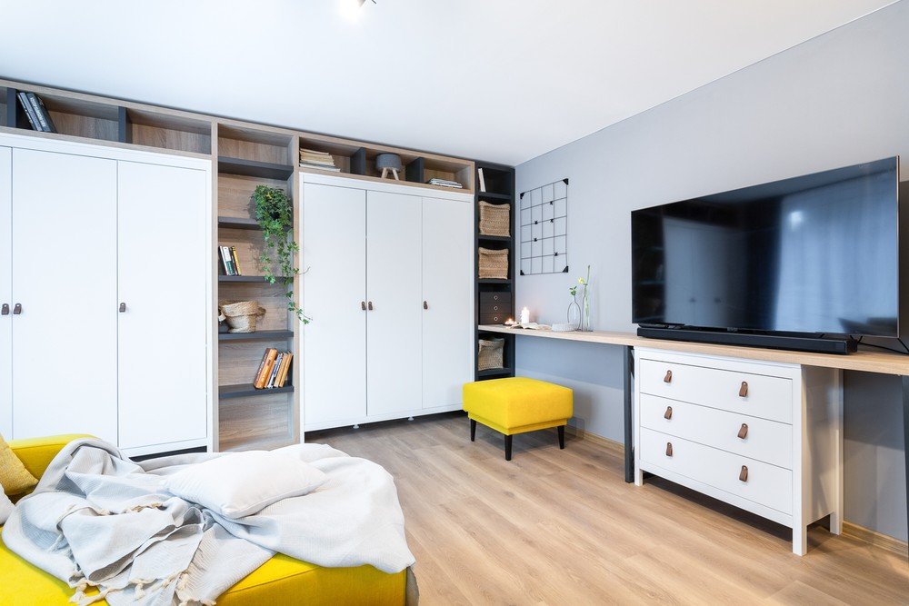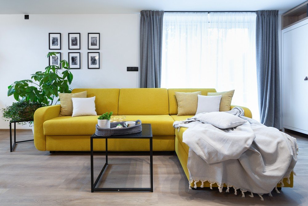 Da pa notranjost ne bi bila videti dolgočasna, so jo osvežili s svetlo rumenim kavčem, ki ga je mogoče preprosto raztegniti v udobno zakonsko posteljo. Za lažje rokovanje so se oblikovalci zanesli na sklop minimalističnih mizic za kavo v črni barvi.
