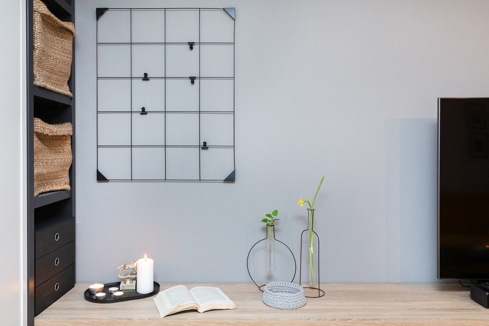 Bele omare in komoda z ročaji iz usnja nudijo veliko prostora za shranjevanje. Blazine, pletenine in nove kovinske vaze pa prispevajo k udobnemu občutku v prostoru.