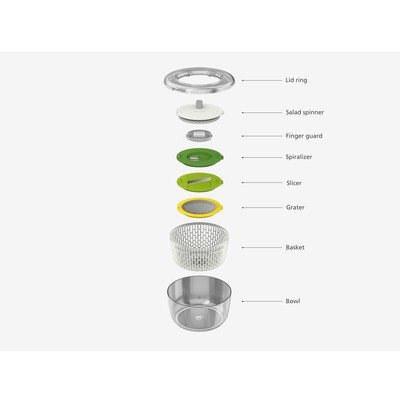 Osrednji del tega kompleta Multi-Prep je vrtič za solato, ki se uporablja za temeljito pranje in nato sušenje oprane solate. Sredinski disk v pokrovu posode lahko nato zamenjate z diskom, ki se uporablja za spiralno rezanje, rezanje ali ribanje zelenjave. Ko operete in posušite vse nastavke, jih preprosto položite v notranjo košaro vrtljive centrifuge.