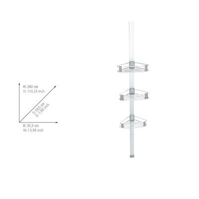 Polica ima tri nastavljive vogalne nivoje, ki jih je mogoče premikati vstran in so opremljeni z ovalnim profilnim nosilcem. Ena od teh polic ima tudi priročne kavlje, na katere lahko obesite gobo za prhanje, krpo za umivanje ali druge manjše predmete. Zaradi teleskopske zasnove je njegova višina nastavljiva od 188 do 280 cm, zato se zlahka prilagodi vašim potrebam.