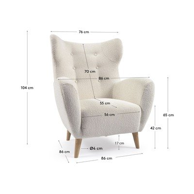 Fotelj je oblazinjen s tkanino bouclé, ki mu daje prijetno teksturo. Stabilnost zagotavljajo močne noge iz bukovega lesa.