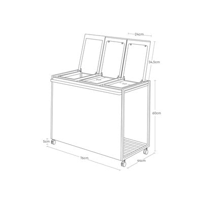 Tridelni zabojnik je praktičen pripomoček pri razvrščanju odpadkov. Opremljen je s kolesi in z ročaji za lažje rokovanje. Kovinska konstrukcija ima plastične pokrove na tečajih z okvirjem za obešanje treh vrečk in sprednji polni del, ki poskrbi, da so odpadki skriti. Spodnjo polico lahko uporabite za odlaganje rezervnih vrečk in jih imate vedno pri roki.