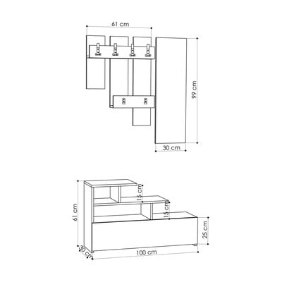Ta predsobni komplet sestavljajo omarica za čevlje (100 x 61 x 30 cm), ogledalo (30 x 99 cm) in stenski obešalnik širine 61 cm.
