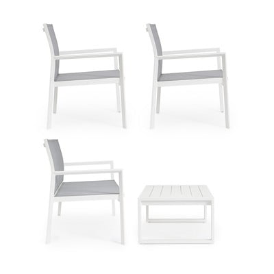 Vrtno garnituro Kallen proizvajalca Bizzotto iz belega aluminija sestavljajo kavč, dva fotelja in miza. Komplet je idealna izbira za sprostitev na terasi, vrtu ali ob bazenu. Komplet je izdelan iz aluminija, odpornega na vremenske vplive. Kavč, ki meri 126 x 67,5 x 82 cm, in fotelja, ki merita 68 x 67,5 x 82 cm, imata udobne naslone za roke in naslonjala. Priročna mizica velikosti 90 x 56,5 x 34 cm zagotavlja veliko prostora za pijačo in prigrizke. Zaradi nevtralne barvne kombinacije je komplet enostavno uskladiti z drugim vrtnim pohištvom in dodatki.