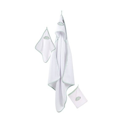 Komplet brisač Happy Cloud znamke Roba je idealen za nego dojenčkov. Komplet vsebuje brisačo s kapuco (80 x 80 cm), majhno brisačo (30 x 30 cm) in krpico za umivanje (16 x 20 cm).