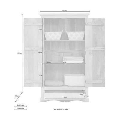Iz masivnega manga, površinska obdelava: lak, bela, širina 100 cm, višina 175 cm, globina 40 cm
