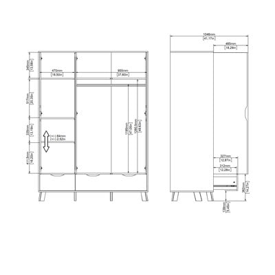 Ta prostorna garderobna omara v beli hrastovi barvi ima tri vrata, od katerih je eno opremljeno z ogledalom. V notranjosti boste našli dve nastavljivi in dve fiksni polici ter palico za oblačila. Na dnu omare se nahajajo trije prostorni predali. Z dimenzijami 147x201x58 cm zagotavlja dovolj prostora za shranjevanje oblačil in dodatkov.