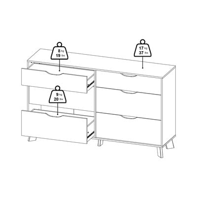 S dimenzijami 156x92x40 cm ponuja šest prostornih predalov s krogličnimi ležaji za enostavno odpiranje. Bele fronte predalov so v kontrastu z naravnim hrastovim premazom okvirja, kar ustvarja sodoben in prefinjen videz. Praktični izrezi namesto ročajev dajejo komodi čist dizajn.