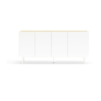 Belo komodo iz kolekcije Arista odlikujejo čiste linije. Ker so vsi robovi poševni, je pohištvo videti subtilno, kot da njegove stene nimajo debeline. Lakirana vrata dopolnjuje zgornji del iz hrastovega furnirja.
