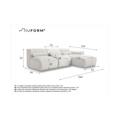 Desni kot/z ležalnikomKremno belaTrisedežnaŠirina 244 cmGlobina 154 cmGlobina sedeža 58 cm