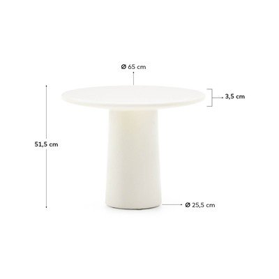 Klubska mizica Albanella znamke Kave Home harmonično združuje slog in praktičnost. Ta okrogla mizica z visokim sijajem je izdelana iz GFRC, kompozitnega materiala iz cementa, ojačanega s steklenimi vlakni. Zaradi tega je lahka in odporna na obrabo, hkrati pa ohranja trdno konstrukcijo.