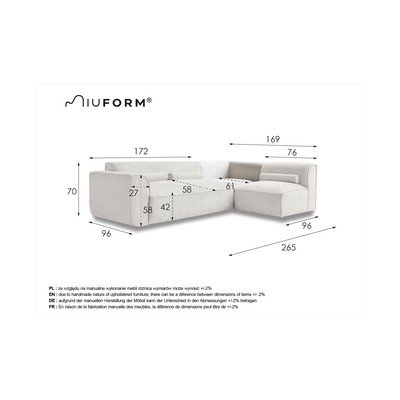 Desni kot/v obliki črke LBežŠtirisedežnaŠirina 265 cmGlobina 169 cmGlobina sedeža 58 cm