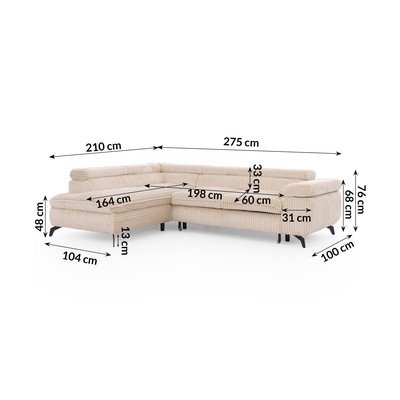 Iz rebrastega žametaNastavljiva/raztegljiva/s prostorom za shranjevanjeLevi kot/v obliki črke LBežPrimerna za hišne ljubljenčke/odporna na madežeŠtirisedežnaŠirina 275 cm