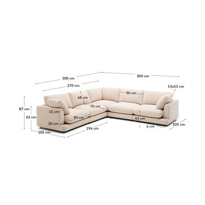 Kotna sedežna garnitura Gala znamke Kave Home je kos pohištva, ki v vaši dnevni sobi združuje dizajn, udobje in kakovost. Njene zaobljene oblike in dimenzije ustvarjajo prijetno vzdušje, idealno za uživanje v izjemnih trenutkih z družino ali prijatelji.