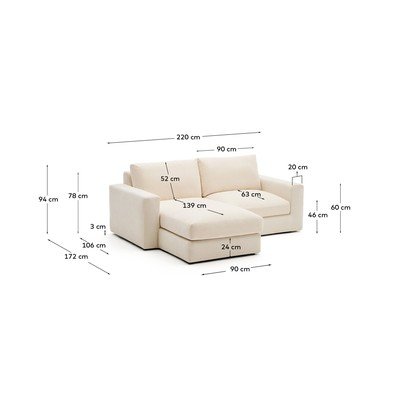 Iz šeniljeLevi kot/z ležalnikomS snemljivo prevlekoBežTrisedežnaŠirina 220 cmGlobina 172 cmGlobina sedeža 63 cm