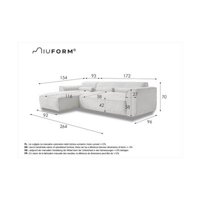 Levi kot/z ležalnikomBežTrisedežnaŠirina 264 cmGlobina 154 cmGlobina sedeža 58 cm