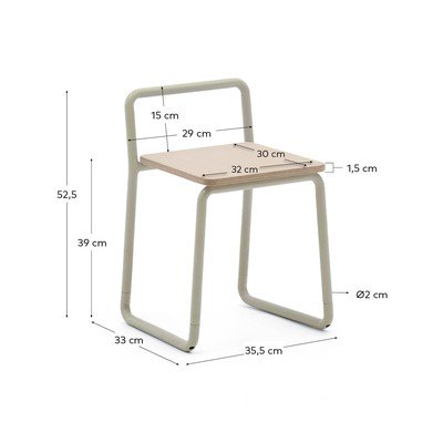 Njegova zasnova spretno združuje cevasto kovinsko konstrukcijo z naravnim videzom lesa, kar mu daje igriv in hkrati eleganten videz.