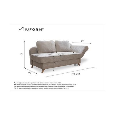 Desni kot, iz rebrastega žameta, bež, širina 216 cm, globina 92 cm, teža 62 kg