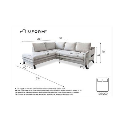 Iz šeniljeRaztegljivaLevi kot/v obliki črke LBežŠtirisedežnaŠirina 234 cmGlobina 200 cmGlobina sedeža 54 cm