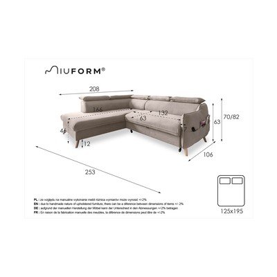 Nastavljiva/raztegljivaLevi kot/v obliki črke LBežŠtirisedežnaŠirina 253 cmGlobina 208 cmGlobina sedeža 63 cm