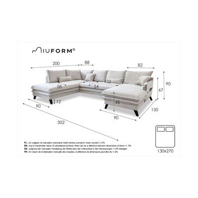 Iz šeniljeRaztegljiva/s prostorom za shranjevanjeLevi kot/v obliki črke "U"Svetlo sivaVečsedežnaŠirina 302 cmGlobina 200 cmGlobina sedeža 58 cm