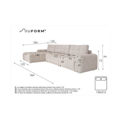 Raztegljiva/s prostorom za shranjevanjeLevi kotBežVečsedežnaŠirina 364 cmGlobina 184 cmGlobina sedeža 56 cm