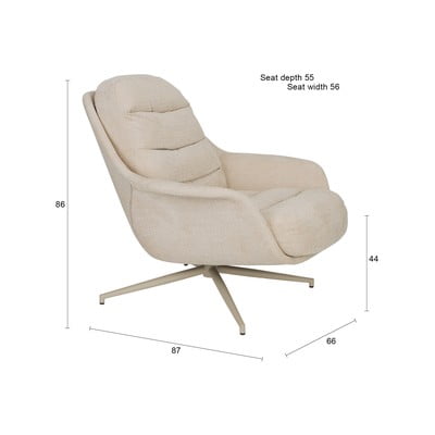 Bež vrtljivi fotelj Philly iz podjetja Zuiver ponuja največje udobje zaradi debelih odstranljivih sedežnih in hrbtnih blazin, ki jih na mestu trdno držijo velcro trakovi. Fotelj ima vrtljivo podnožje iz prašno lakirane kovine, ki zagotavlja stabilnost in sodoben videz. Idealna izbira za sprostitev v vsaki notranjosti.