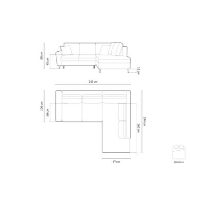 Žametna, raztegljiva/s prostorom za shranjevanje, desni kot/v obliki črke L, bež, štirisedežna, širina 243 cm