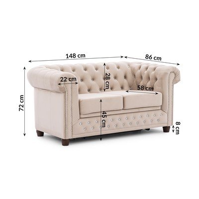 Žametna, raztegljiva, Chesterfield, bež, vodoodporna/odporna na madeže, dvosedežna, širina 148 cm