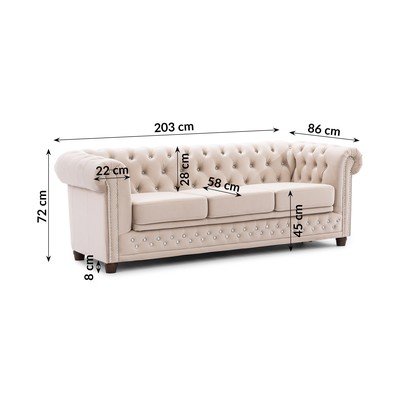 Žametna, raztegljiva, Chesterfield, bež, vodoodporna/odporna na madeže, dvosedežna, širina 203 cm