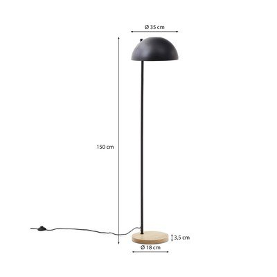Talna svetilka Catlar proizvajalca Kave Home je izdelana iz kovine s črnim zaključkom. Svetilka ima polkrožno senčilo in stoji na preprostem podstavku iz jesenovega lesa. Združljiva je z žarnico E27 z največjo močjo 40 W. Žarnica ni priložena.