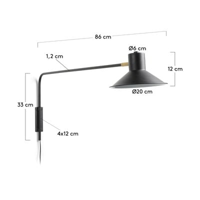 Stenska svetilka Aria proizvajalca Kave Home je izdelana iz črnega lakiranega jekla. Ima prilagodljivo senčilo, ki omogoča enostavno usmerjanje svetlobe tja, kjer jo potrebujete. Svetilka je združljiva z žarnico E14 z največjo močjo 25 W. Žarnica ni priložena.