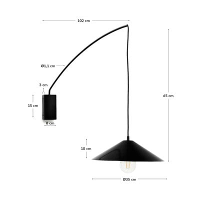 Stenska svetilka Kally podjetja Kave Home je idealen pripomoček za tiste, ki iščejo izvirno in elegantno osvetlitev. Svetilka je izdelana iz kovine in navdušuje z nenavadno obliko s stožčastim senčnikom, obešenim na kablu iz blaga. Za uporabo je treba kupiti žarnico z navojem E27 z največjo močjo 40 W.