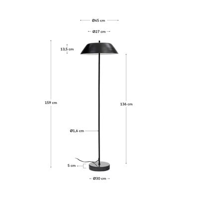 Talna svetilka Sayra podjetja Kave Home bo v vašo notranjost vnesla minimalistično eleganco. Svetilka je visoka 153 cm in jo sestavlja kovinsko senčilo v črni barvi, ki je nameščeno na vitki palici. Stabilnost svetilki daje okroglo podnožje iz črnega marmorja, zaradi katerega je vsak kos originalen z edinstvenim vzorcem in teksturo.