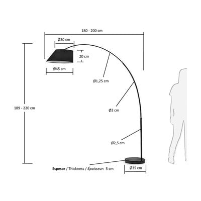 Črna talna svetilka s tekstilnim senčnikom združuje eleganco in funkcionalnost. Njeno kovinsko stojalo z nastavljivo višino od 189 do 220 cm in vrtljivo držalo s 180 do 200 cm širine omogočata prilagodljivo osvetlitev prostora. Črna barva kovinske konstrukcije in bombažnega senčila ustvarja enoten, eleganten videz.