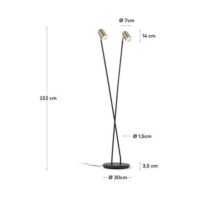 Talna svetilka Clemence podjetja Kave Home navdušuje z elegantnim kontrastom črne kovinske strukture in dveh medeninastih senčil. Visoka je 152 cm in opremljena z dvema senčnikoma, ki vam omogočata, da svetlobo usmerite po potrebi. Svetilka je združljiva z žarnicami LED E27 z največjo močjo 3 W.