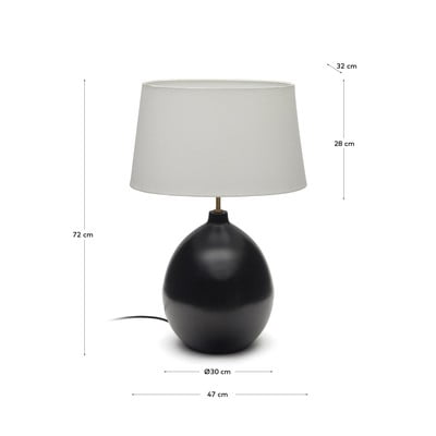 Namizna svetilka Foixa podjetja Kave Home navdušuje s kontrastno kombinacijo črnega kovinskega podstavka in belega senčila iz blaga. Svetilka je združljiva z žarnicami E27 z največjo močjo 40 W. Žarnica ni priložena.