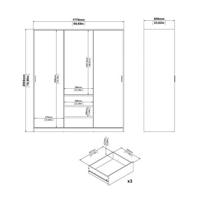 Z dimenzijami 177x200x60 cm zagotavlja veliko prostora za vaša oblačila. Garderobna omara ima dvoje drsnih vrat, ena vrtljiva vrata, tri predale ter kombinacijo polic in palic za obešanje oblačil. Okras hrasta in naravna barva dajeta omari eleganten videz, ki je primeren za sodobne interierje.