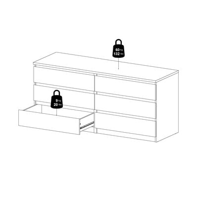 S dimenzijami 154x70x50 cm ponuja šest prostornih predalov za veliko prostora za shranjevanje. Gladka jeklena vodila zagotavljajo enostavno odpiranje in zapiranje. Zasnova brez ročajev daje komodi čist, sodoben videz. Naravni hrastov premaz je enostavno vključiti v različne sloge notranjosti.