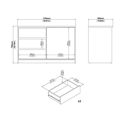 Na levi strani najdete tri prostorne predale, na desni strani pa se skriva omarica z drsnimi vrati in fiksno polico. Preprosta in sodobna zasnova se prilega različnim notranjim prostorom.