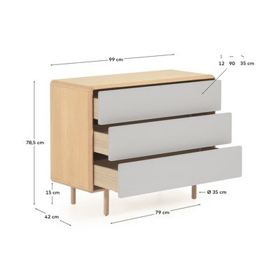 Komoda ima tri predale, ki se odpirajo z mehanizmom push-to-open. Njeni zaobljeni robovi in vitke noge dajejo pohištvu lahkoten videz. Noge so tudi nastavljive, kar zagotavlja stabilnost na vsaki površini.
