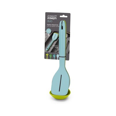 Komplet kuhinjskih pripomočkov Duo znamke Joseph Joseph je odličen pripomoček za vsako kuhinjo. Komplet vsebuje štiri praktična orodja v elegantnih odtenkih.