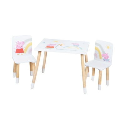 Ta komplet otroškega pohištva vključuje mizo in dva stola, ki so zasnovani za udobno in varno sedenje. Zaradi svoje kompaktne velikosti je kot nalašč za otroško sobo ali igralni kotiček. Stola imata višino sedeža 28 cm in skupne mere 54 × 26,5 × 26,5 cm. Miza meri 49 × 60 × 50 cm.
