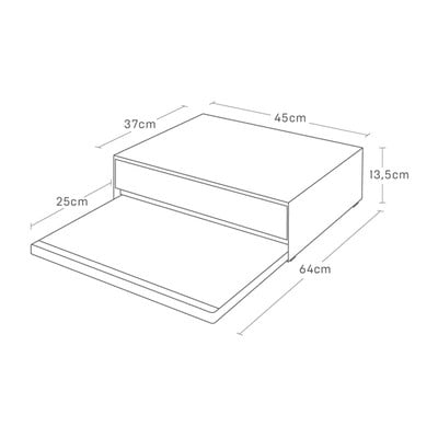 Izkoristite svoj kuhinjski prostor s to polico s predalom, ki v trenutku razširi delovno površino, če jo delno zasedajo majhni aparati. Dolžino police, ki jo lahko namestite nad in pod predal, lahko prilagodite od 39 do 64 cm. Nosilnost zgornje plošče je 17 kg, predal in polica pa lahko nosita do 3 kg teže, pri čemer mora biti na zgornji plošči od tega vsaj 2 kg teže.
